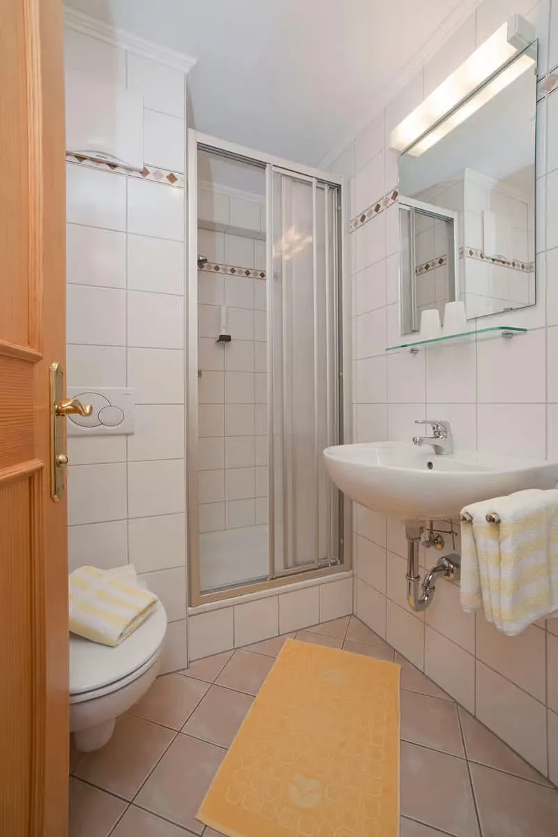 - Helles Bad mit Dusche und Toilette sowie Pflegeprodukten