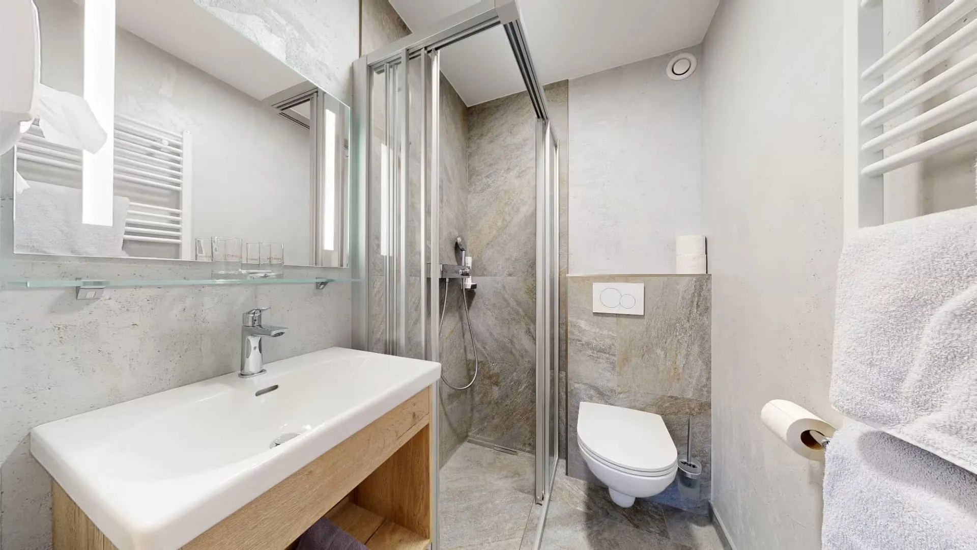 - Helles Bad mit Dusch und Toilette sowie Pflegeprodukten